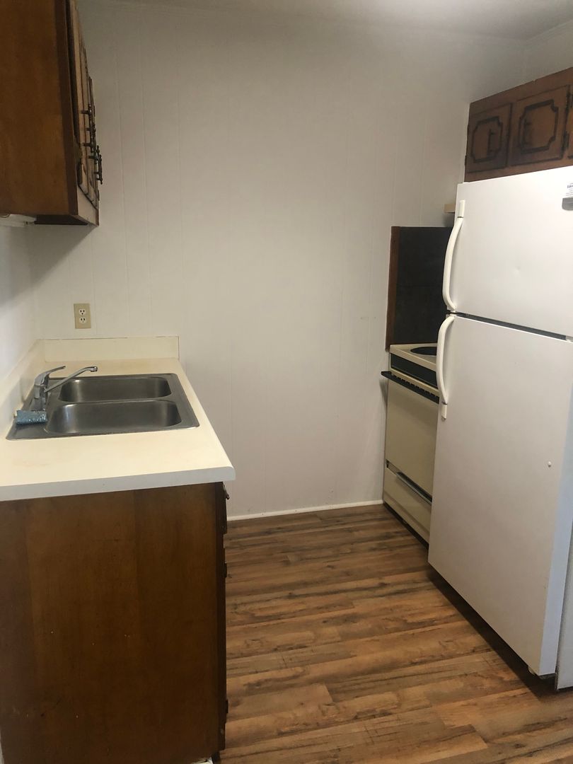This 1 bedroom, 1 bath upstairs end unit. Laminate flooring and kitchen with stove and refrigerator. Window air and electric heat. Rent includes water, sewer, trash and landscaping.